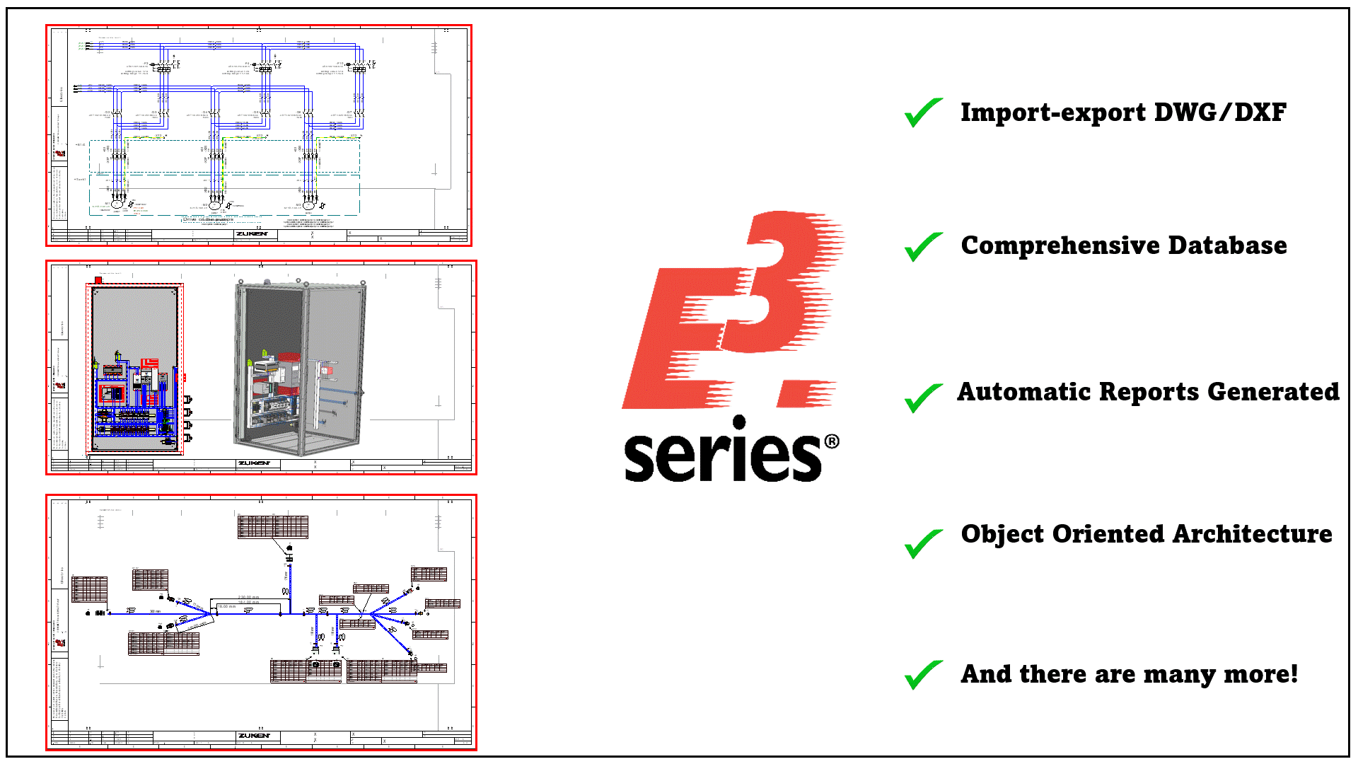 E3.Series from Zuken is a modular software suite for electrical, wiring, and fluid system design.It includes 4 different Key modules, all working in a database-driven environment for consistency and automation.